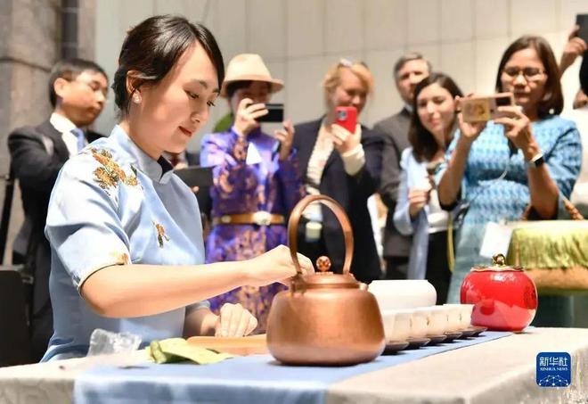 △八马首席茶仙子姜雨桐在联合国粮农组织总部进行茶艺展示,向世界敬呈来自中国的精湛茶艺 图源:新华社