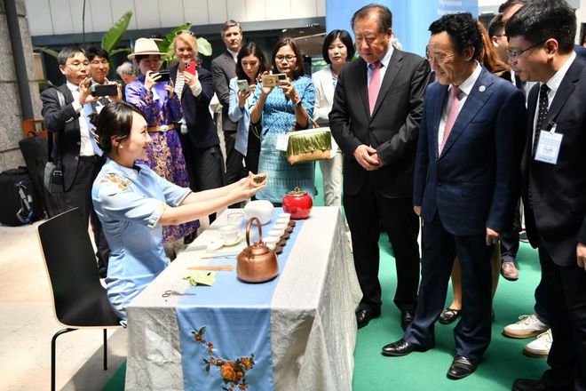 △国家级非遗传承人、八马茶业董事长王文礼向中国常驻联合国代表张军大使及联合国官员、多国常驻代表介绍中国茶产业发展历程
