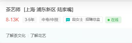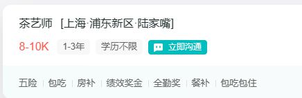 而且茶艺师是国家职业技能工种之一,考取证书后多一个技能傍身也很nice。随便去招聘网站一搜,上海的茶艺师薪资水平也是很可观的,对学历没有过多要求,看中的都是个人的技能。