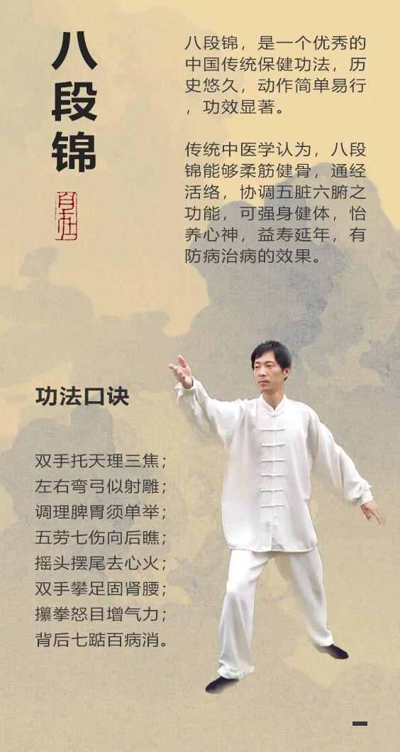 八段锦,是一个优秀的中国传统保健,历史悠久,动作简单易行,功效显著。传统中医学认为,八段锦能够柔筋健骨,通经活络,协调五脏六腑之功能,可以强身健体,怡养心神,益寿延年,有防病治病的效果。