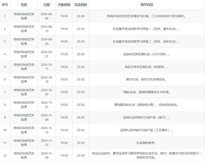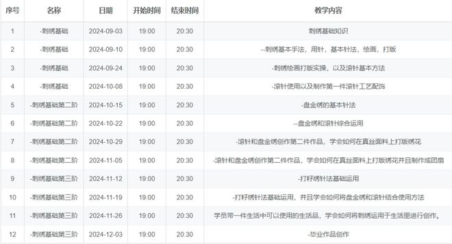 学习刺绣基础绘画、刺绣打版、刺绣图案的传统文化和运用、滚针和打籽绣技法。完成滚针和打籽绣制作的成果类作品(计划车挂或梦网)然后学习盘金绣,绘画纹样结合第一个刺绣技法,完成三类刺绣综合技艺的团扇刺绣作品制作。我们会教学员带上自己生活上会用到的衣服,比如T恤、枕头套等等。刺绣课程有一点难度,但是循序渐进每个月学习会有成果作品,最后成果展示。
