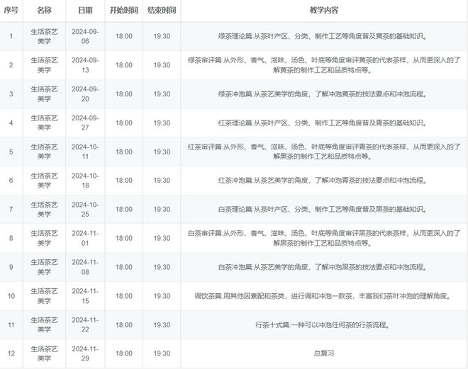 本次课程系《生活茶艺美学》课程下篇。课程内容主要包括:绿茶、红茶、白茶的理论、审评及冲泡,另外有调饮茶和茶修课程体系中的行茶十式。理论课,通过对茶类产区、树种、品类等知识的普及,帮助我们了解这类茶基础知识。审评课,通过审评茶叶的形、色、香、味等,帮助我们认识这款茶的原料、制作工艺、存储等是否恰到好处等。茶艺冲泡课,通过一定的茶艺冲泡流程,帮助我们在日常生活中更好的冲泡这杯茶。调饮茶和行茶十式,是丰富和提升我们对茶艺冲泡的理解和运用。