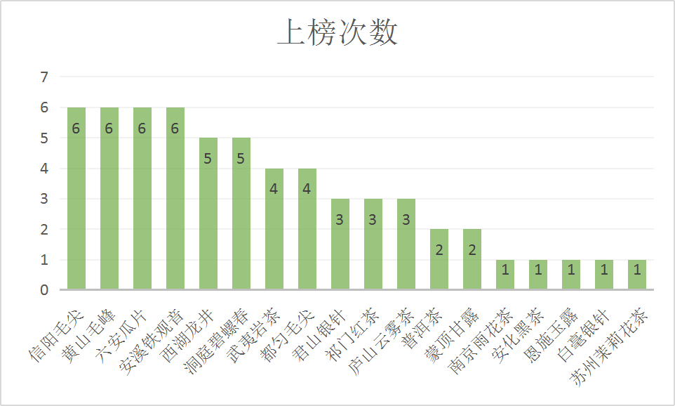 我们选取的第一个评价标准,就是看看历次入选的18种茶里面,各种茶的上榜次数有多少。稍作统计不难得出: