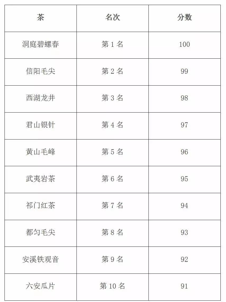 第一次,1915年巴拿马万国博览会,将碧螺春、信阳毛尖、西湖龙井、君山银针、黄山毛峰、武夷岩茶、祁门红茶、都匀毛尖、铁观音、六安瓜片列为中国十大名茶。