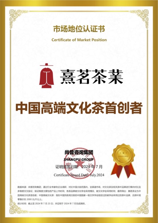 2024年7月,尚普咨询集团有限公司(以下简称“尚普咨询集团”)对中国高端文化茶产品全渠道市场(中国高端文化茶首次上市时间至2024年7月)进行深度调研,经专家和企业调研以及终端渠道交叉验证后,于近日给高端文化茶行业龙头企业——熹茗茶业,颁发了“中国高端文化茶首创者”的市场地位声明认证!