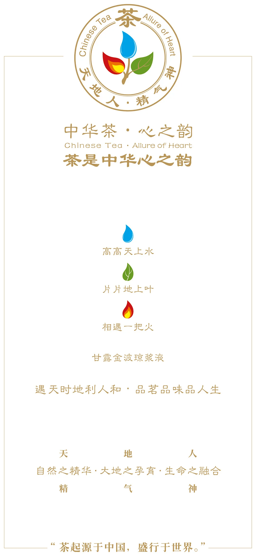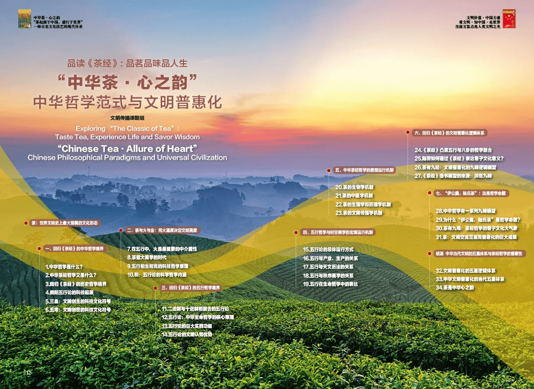“让更多的人知茶、爱茶,共品茶香茶韵,共享美好生活。”为此,在序篇“品读《茶经》:品茗品味品人生——中华哲学范式与文明普惠化”中,《中华茶·心之韵》在思想层次上,描绘了茶文化、茶产业与中华五行哲学的建构意义,并以回归唐代陆羽《茶经》的哲学境界为主题,论证了在中医药理论体系贯通下,中华茶经哲学的微观运行机制和以茶瓷等为代表的,中华科技文明向世界普惠化的历史进程。