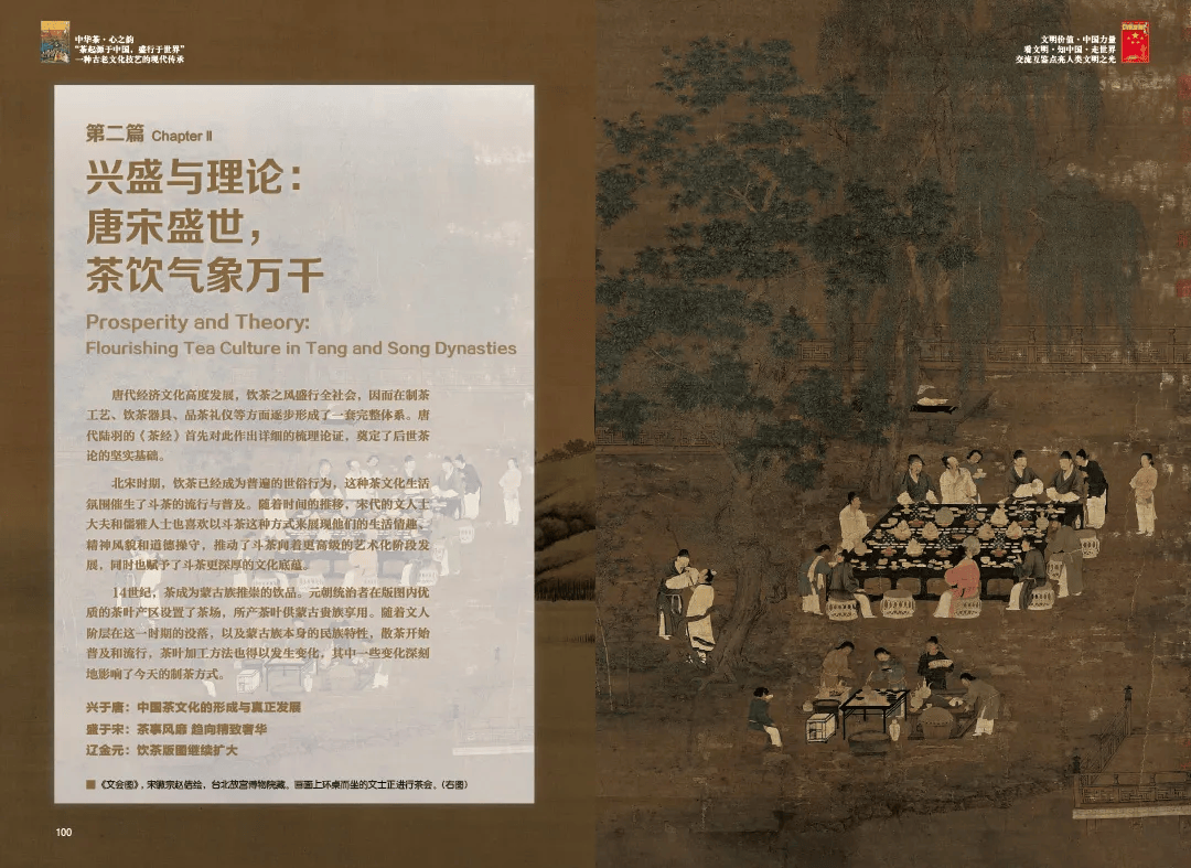 在第二篇“兴盛与理论:唐宋盛世,茶饮气象万千”中,《中华茶·心之韵》展开了茶文明圈的叙事:唐代在制茶工艺、饮茶器具、品茶礼仪等方面逐步形成一套完整体系,陆羽《茶经》奠定了后世论茶的坚实基础,茶诗、茶画也伴随盛唐茶文化而大兴。此时,亚洲开始形成茶文明圈。北宋时期饮茶已经成为普遍的世俗行为,茶文化生活氛围催生了斗茶的流行与普及,影响了辽金茶文化的形成,宋徽宗《大观茶论》将茶文化推向极致。元代,散茶开始出现。