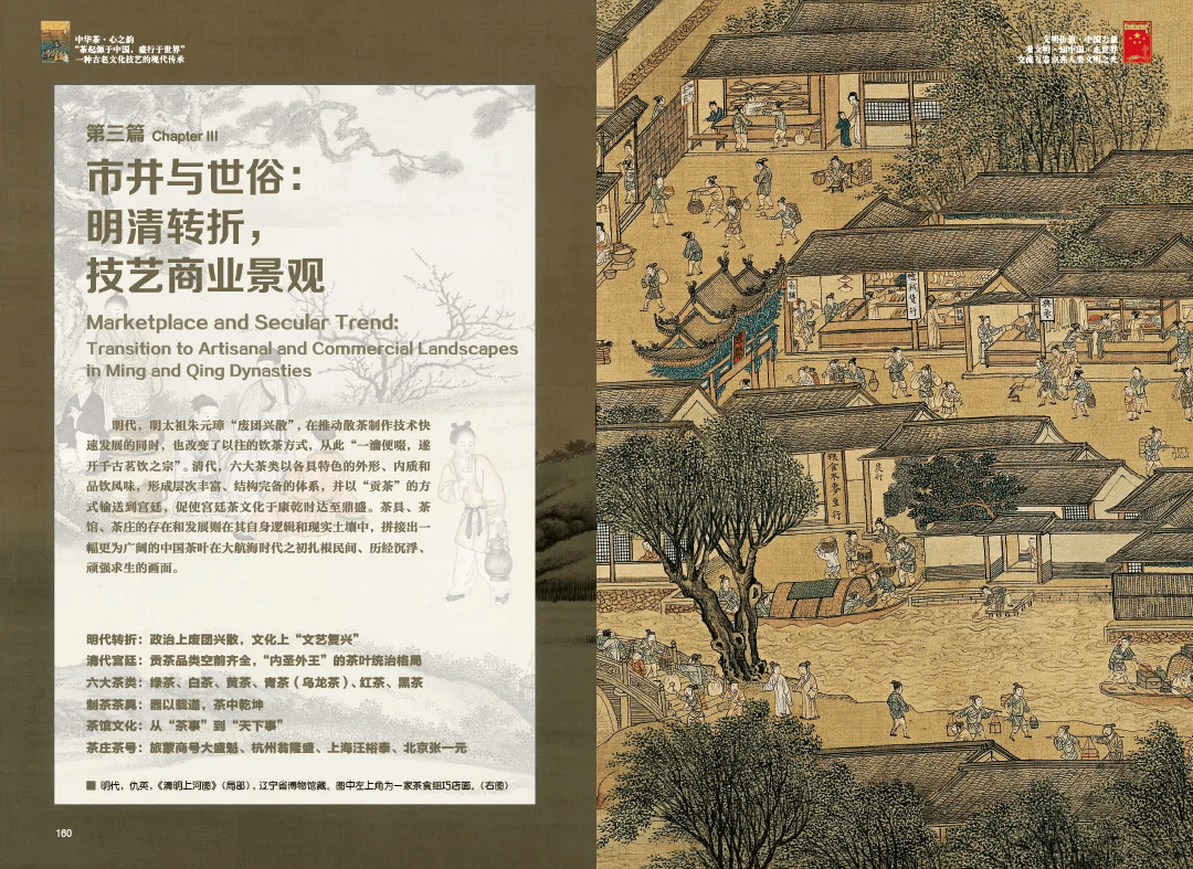 在第三篇“市井与世俗:明清转折,茶艺商业景观”中,《中华茶·心之韵》总结到:明代,明太祖朱元璋“废团兴散”,从此“一瀹便啜,遂开千古茗饮之宗”。清代,六大茶类形成层次丰富、结构完备的体系,并以“贡茶”的方式输送到宫廷,促使宫廷茶文化于康乾时达至鼎盛。茶具、茶馆、茶庄的存在和发展则在其自身逻辑和现实土壤中,拼接出一幅更为广阔的中国茶叶在大航海时代之初扎根民间、历经沉浮、顽强求生的画面。