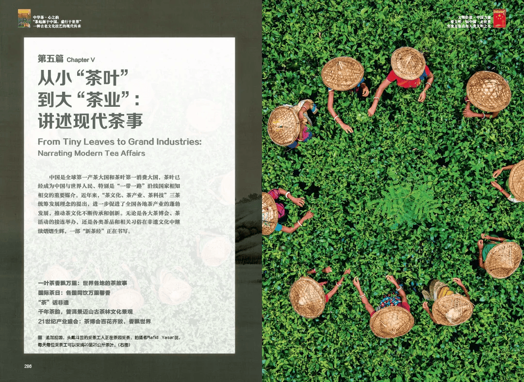在第五篇“从小‘茶叶’到大‘茶业’:讲述现代茶事”中,《中华茶·心之韵》描画了“茶文化、茶产业、茶科技”三茶统筹发展理念,进一步促进了全国各地茶产业的蓬勃发展。无论是各大茶博会、茶活动的接连举办,还是各类茶品和相关习俗在非遗文化中继续熠熠生辉,一部“新茶经”正在书写,百花齐放,香飘世界。