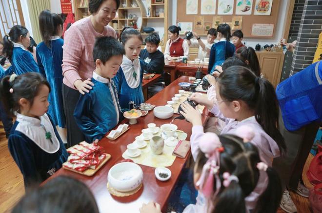 在这样的理念指引下,针对幼儿园孩子,设计《四季茶宝乐园》游戏化课程,让孩子们在“茶礼敬长辈”的角色扮演中学会感恩;小学阶段的《茶香生活》课程,则通过“制作茶香包”“设计茶席”等实践活动,将数学的计量、美术的构图、科学的植物认知融入其中;中学的《“一带一路”茶文化》课程更具深度,将“一带一路”沿线国家的不同地域文化和茶文化作为教育内容,面向广大青少年传播知识、文化,提升国际视野,通过各地名茶的实践学习,增进学生动手能力及合作能力,通过小组合作主题探究学习,培养团队协作能力。