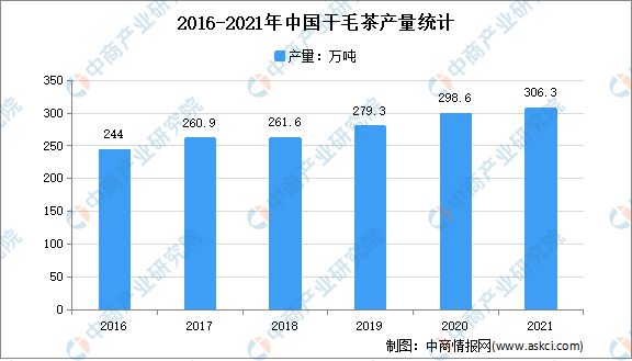 2021年全国干毛茶总产量306.32万吨,比上年增加7.71万吨,增幅2.6%。产量超过30万吨的省区有福建省、湖北省、云南省、四川省、贵州省。增产万吨以上的省区有四川省、湖北省、福建省、广西壮族自治区。2020年全国干毛茶总产值为2928.14亿元,增长301.56亿元,增幅11.48%。