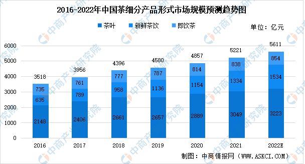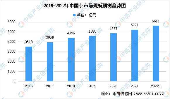 得益于中国人对健康生活方式的关注不断提高以及过去几十年间中国人均可支配收入持续增加,按收益计,中国茶市场的市场规模由2016年的3518亿元增加至2021年的5221亿元,复合年增长率为8.2%,尽管受到全球新冠疫情的影响,预计2022年中国茶市场的市场规模将达到5611亿元。