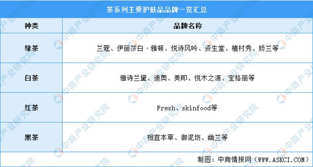 茶叶本身具有显著的养颜功效,茶类中所含有都茶多酚,其实是一种优质的抗氧化剂,能有效改善暗沉肤色,并减缓肌肤氧化,保持肌肤水润有光泽,延缓肌肤衰老。同时,茶叶本身就具有一定的清洁、下火、消炎等功效,添加在护肤品中也能起到一定的消炎镇定效果。添加茶叶提取物可以有效延长护肤品的货架寿命,因此,品牌方不断推出茶系列的护肤品,既是打造了“天然成分”,也使护肤品寿命更长,可盈利性更高。具体主要品牌如下图所示: