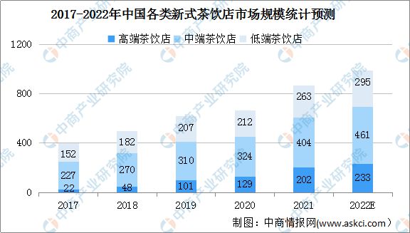 近年来,我国新式茶饮门店数量和新式茶饮消费者数量大幅上升。根据不同的定位,我国新式茶饮门店可以分为高端新式茶饮店、中端新式茶饮店和低端新式茶饮店三大类。数据显示,2020年我国高端新式茶饮店、中端新式茶饮店和低端新式茶饮店市场规模分别达129亿元、324亿元和212亿元,同比分别增长27.7%、4.5%和2.7%。由此可见,高端新式茶饮店增速较快。预计2022年我国高端新式茶饮店、中端新式茶饮店和低端新式茶饮店市场规模分别达233亿元long8唯一官网、461亿元和295亿元。