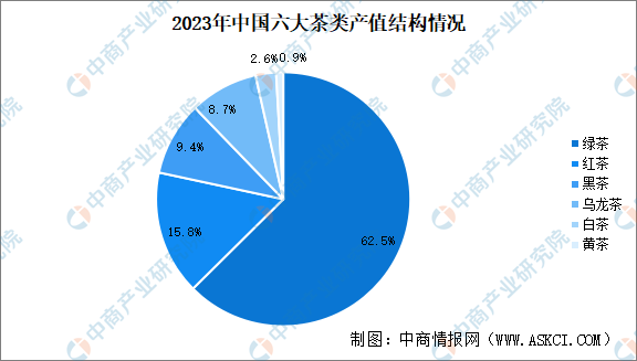 绿茶、红茶、黑茶、乌龙茶、白茶、黄茶的产值比例为62.5:15.8:9.4:8.7:2.6:0.9;绿茶、红茶在总产值的占比下降,黑茶、乌龙茶白茶、黄茶占比攀升。