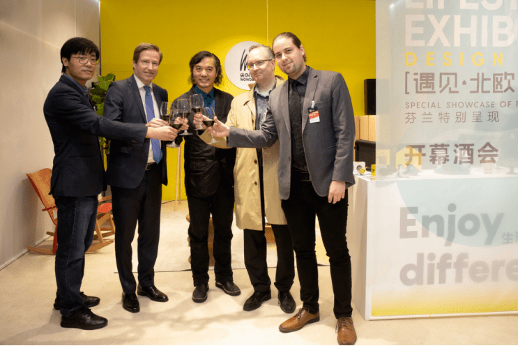 从左至右:尖叫设计总经理王江、芬兰驻沪总领事何朗明、上海联创设计集团股份有限公司董事长&总裁,尖叫设计品牌创始人薄曦、芬兰贸易和创新领事,上海办公室负责人米卡博士、芬兰驻沪总领事馆芬兰国家推广官员马维