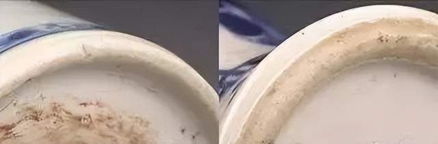 第三组图片:胎质的不同,更要注意康熙瓷器器足处理规矩清楚,胎质坚硬紧实。光绪瓷器器足棱角不分明,胎质疏松