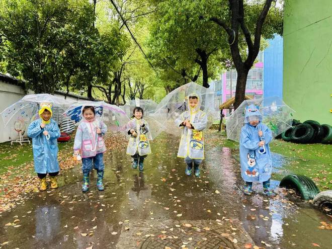 滴答滴答,谷雨到。穿上雨衣、撑起雨伞、套上雨鞋!感受湿润的气息,摸摸春雨的温度,孩子们一起收集春雨,用耳朵聆听春雨落在雨伞上的声音,在春雨中尽情享受踩水的快乐。