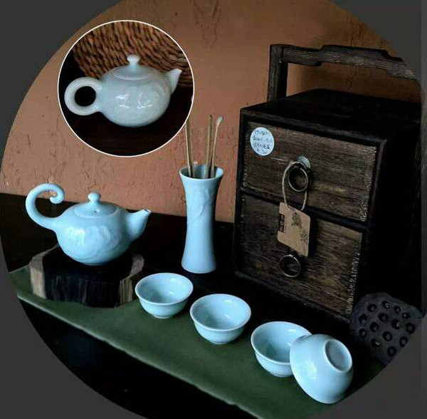手工雕刻青瓷茶具六件套,珍藏品,底部印赵俊璞款式;青瓷古韵,雕刻荷花装饰,和和美美,简洁高雅;手工木制提盒,火烧处理,古色古香,与青瓷茶具相得益彰。
