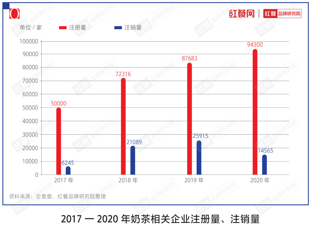 企查查数据显示,2020年我国在业奶茶相关企业多达30.63万家,且近四年注册量上升趋势明显。2017年奶茶相关企业注册量5万家,2019年增至8.77万家,2020年新增注册量达到9.43万家。