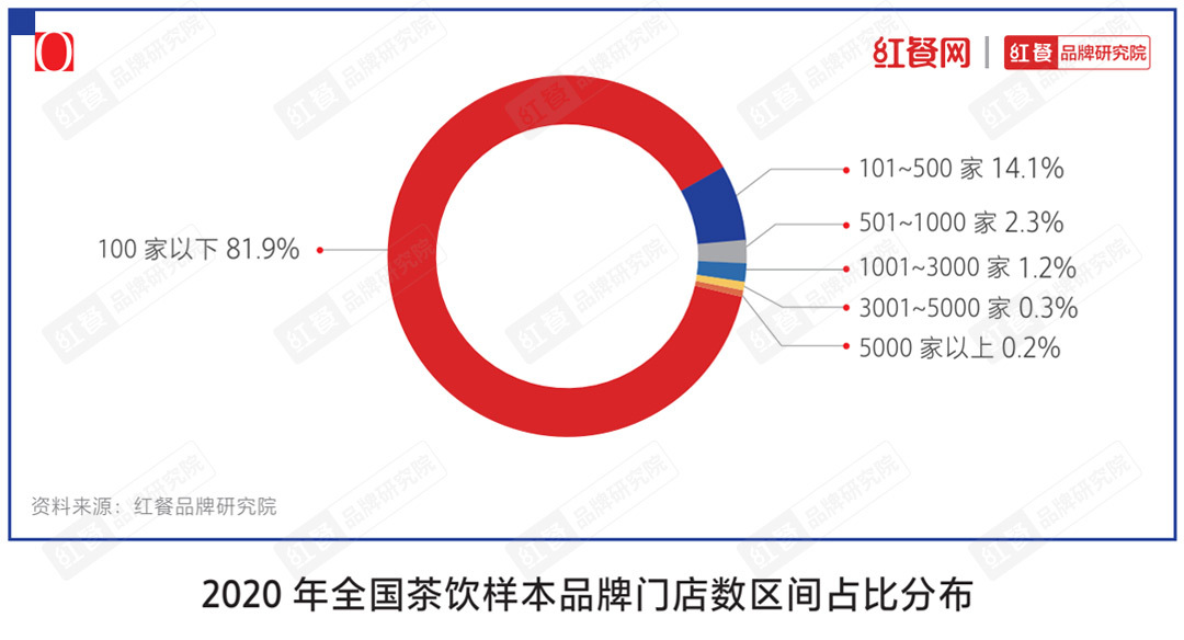 另一方面,根据《中国餐饮品类和品牌发展报告2021》数据,2020年茶饮品牌门店总数在100家以下的占到81.9%。可见在现制茶饮行业中,大部分茶饮品牌门店数量偏少,整体规模也普遍偏小,竞争力尚不强,也给了很多新进入的茶饮品牌以机会。
