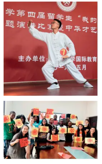 走上舞台,展示中国传统文化韵味。为给国际学生营造良好的学习中文与中国文化的氛围,国际教育学院每年都会举办“国际汉语文化节”,活动包括演讲比赛、中国文化知识竞赛、汉字听写大赛、中华才艺大赛等,“国际汉语文化节”已成为国际学生展示知识和才艺的舞台。多种多样的比赛活动为学生积累了丰富的舞台经验,帮助他们在校外的各类活动和比赛中表现优异。第十一届中国-东盟教育交流周“文艺汇聚,彰显中国风”中华才艺比赛中,贵州大学国际学生表演的贵州芦笙舞荣获一等奖;由贵州省教育厅、贵州省语言文字工作委员会举办的2019年中华经典诵写讲大赛中,贵州大学国际学生表演的中国古诗词串烧“上下五千年”荣获国际学生组一等奖;2020年,贵州大学国际学生诵读作品“问仁”获得由教育部、国家语委主办的第二届中华经典诵写讲大赛“诵读中国”经典诵读大赛一等奖。“问仁”为原创作品,以古代学宫私塾环境为背景,通过私塾老师与学生的问答,展示从先秦到唐宋中国古代众多经典对“仁”的不同诠释,将主题“问仁”贯穿于整个表演过程中。同时,穿插武术、舞蹈、乐器等不同表演,丰富了节目的表现形式。该节目凭借国际学生对中华文化的深刻领悟和多元的表现形式,向观众展现了独具韵味的中国经典之美,让大家了解到他者视角对中国传统文化的理解。