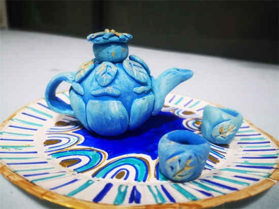 接下来罗老师将事先准备好的蓝色黏土、泡沫球、颜料、水粉笔等材料摆放好,一边介绍制作方法,一边现场制作茶壶的壶身、壶嘴、壶把、壶盖等部件,然后将其组合在一起,进行逐一上色,青瓷蓝的壶体配上釉金的点缀,一套带有浓浓韵味的茶具便制作完毕了。