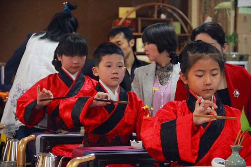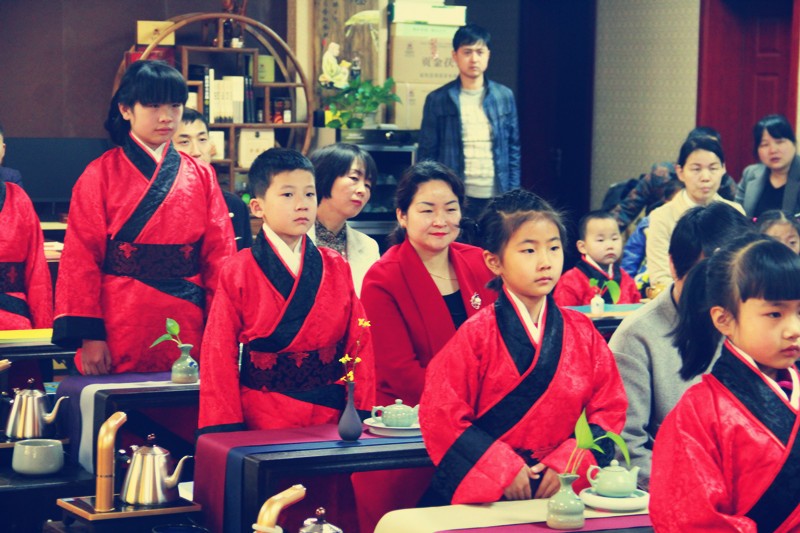 身着汉服,飘带一甩,在悠扬的古琴声中,一位位儒雅飘逸的小茶艺师们走入家长的视野。一个多小时的过程中,小茶艺师们不仅领略了茶艺师的高超技艺,还亲身体验了传统茶道的泡茶过程。尤其在奉茶环节,当家长们喝到孩子亲手泡的热茶、听到一句句感恩的话时,幸福之情溢于言表。