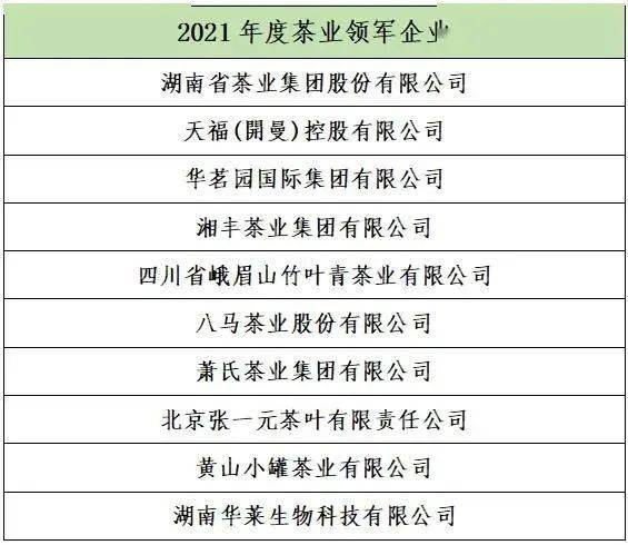 会上,公布了“2021年度茶业领军企业”名单。据悉,为全面展示中国茶产业的经济发展成就,彰显骨干龙头企业的茶产业引领作用,以《关于开展“2021茶业百强企业调查工作”的通知》为基础,经中国茶叶流通协会组织专家团队会商,向社会推荐“2021年度茶业领军企业”。现将名单公布如下: