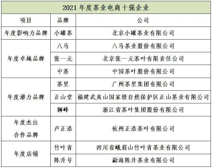 为促进中国茶产业的高质量发展,彰显线上领域优质企业在茶产业发展的突出贡献,中国茶叶流通协会与京东超市携手,以京东集团内部销售数据和中国茶叶行业调查数据为基础,经京东超市推荐,中国茶叶流通协会审核,向社会推荐“2021年度茶业电商十强企业”。现将名单公布如下: