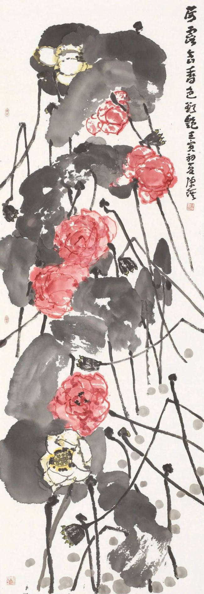 新中国成立后,如何“适应时代、服务时代”是所有艺术家都必须面对的历史课题。对此,陈琪先生用自己杰出的艺术实践交出了一份优秀的答卷,特别是他的花鸟画创作,古意浓郁、新意盎然,风格鲜明,个性强烈,其艺术特色可谓“传统而又现代”。这幅画中的荷花朵朵皆是半开,整幅画茎秆直斜正欹地集散错落“花看半开,酒饮微醉,此中大有佳趣”。