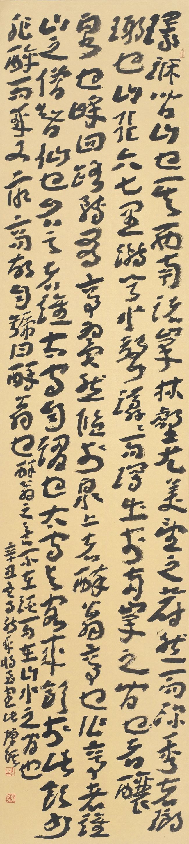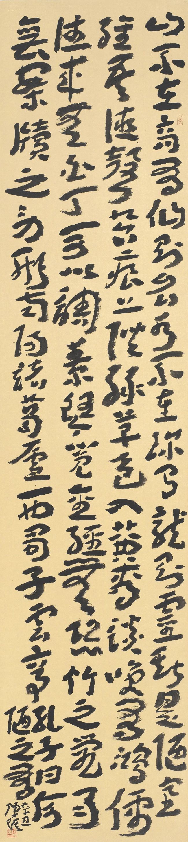 此篇主题为刘禹锡的《陋室铭》,通体用章草书写而成,他的点画、线条沉稳扎实、厚重生辣,可见他几十年的临池之功。在章法上,他对字与字、行与行的各种矛盾关系的处理,比如大小、长短、斜正、疏密,以及行笔的轻重、疾徐等等,驾轻就熟,正奇互用;他对墨法浓淡、干湿把控自如,这些都充分反映出他对于书法创作具有很高的驾驭能力。特别值得称道的是,陈琪先生近十年来把章草作为主攻方向,更表现出他对书法艺术学习的深入和理解的深刻。