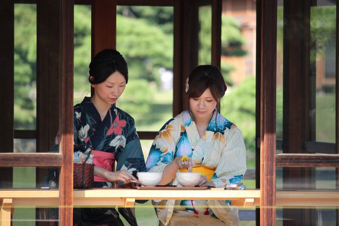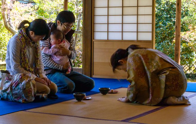 此外游客去日本茶室,通常要先脱鞋,有些更讲究的茶室还得半跪着喝茶。桌面上的精致糕点,什么时候动,吃多少的量,都有一些默认的规矩,这都是对于茶室主人以及茶道文化的尊重。