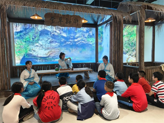 茶博馆中,讲解师向师生们娓娓道来鸠坑茶文化起源、茶具种类以及制茶工艺等。大家在讲解师的带领下,学习茶礼,了解茶道和茶艺,在茶香中感受鸠坑茶文化的魅力。在互动体验区,同学们仔细观察并学习不同品种的茶以及茶起源的知识。