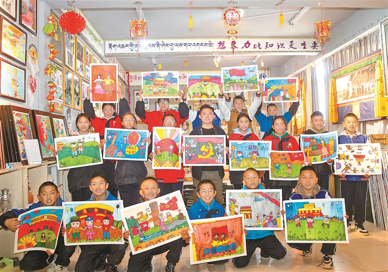 山南市桑日县中学美术兴趣社团的学生展示自己的以“铸牢中华民族共同体意识”为主题的绘画作品。记者洛桑通讯员次仁龙布摄
